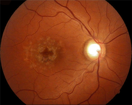 2、斯特格氏病:与眼底黄色斑点症是同一种疾病的不同表现,病灶局限在黄斑区域,发病年龄较早。主要表现为中心视力渐进性地缓慢减退,同时还会合并有色觉障碍,但周边视野较正常,通常最终视力约为0.1左右。